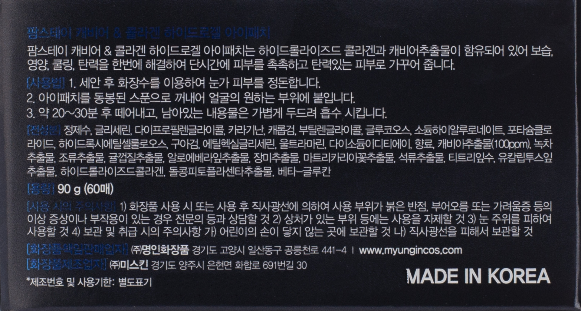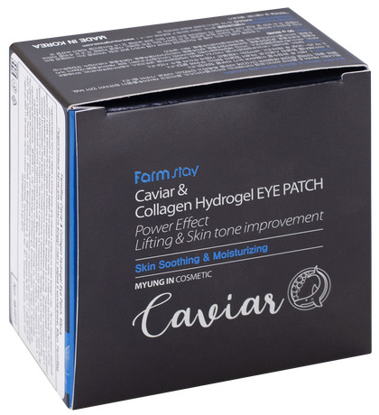 Изготовитель: MYUNGIN COSMETICS CO. LTD., 441-4, Gongneungcheon-ro, Ilsandong-gu, Goyang-si, Gyeonggi-do, РЕСП. КОРЕЯ. Гидрогелевые патчи с икрой и коллагеном для сияния и упругости кожи вокруг глаз. Патчи плотно прилегают к коже, максимально отдавая ей полезные вещества, входящие в состав. Подойдут для сухой, тусклой кожи. Патчи интенсивно увлажняют и успокаивают, повышают эластичность кожи, укрепляет и разглаживают её, уменьшают отечность и круги под глазами. Способ применения: Нанести патчи на очищенную кожу, через 20-30 минут снять, сделать легкий массаж подушечками пальцев.