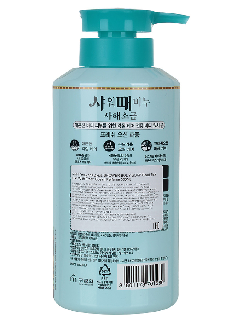 Изготовитель: MUKUNGHWA CO. LTD., Республика Корея, 173, Galmaji-gil, Dongducheon-si, Gyeonggi-do. Бессульфатный гель-эксфолиант для душа. Средство очищает кожу от ежедневных загрязнений, но и от омертвевших клеток, стимулируя регенерацию. Натуральные масла в составе геля питают, увлажняют и смягчают кожу, устраняют сухость и шелушения, защищают от пересыхания. Соль мертвого моря активизирует кровоток, оказывает заживляющее действие, смягчает, питает и очищает кожу, обладает антивозрастным и омолаживающим действием. Способ применения: Для глубокого очищения рекомендуется после купания в теплой воде нанести гель на кожу и оставить на 5 минут, затем смыть теплой водой.
