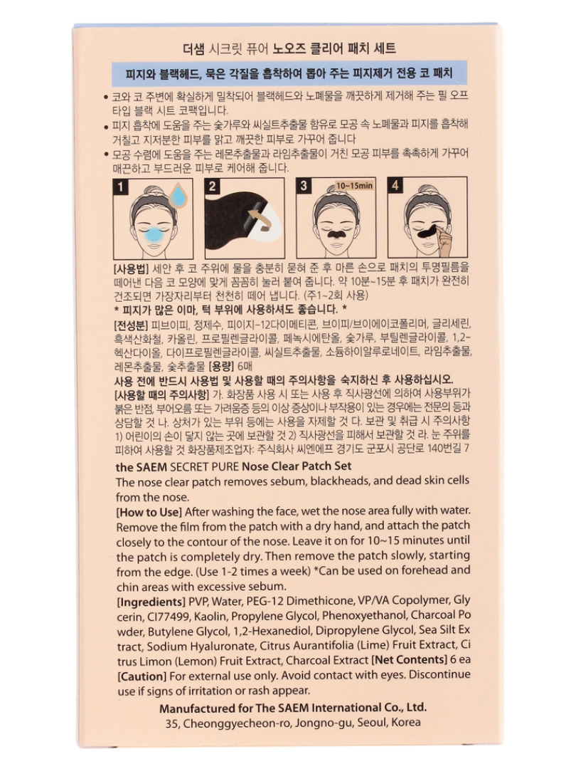 Изготовитель: «THE SAEM INTERNATIONAL CO.LTD. », КОРЕЯ, РЕСПУБЛИКА, 10F, 35, Cheonggyecheon-ro, Jongno-gu, Seoul. Набор патчей для очищения кожи носа от черных точек. Интенсивная эссенция, которой пропитаны патчи, помогает раскрыть поры и "вытянуть" из них скопившиеся сальные пробки, отмершие клетки кожи и любые загрязнения. Способ применения: Очищенную кожу носа намочить водой и наклеить на нее патч. Через 10-15 минут, когда полоска станет сухой и твердой, аккуратно удалить ее.