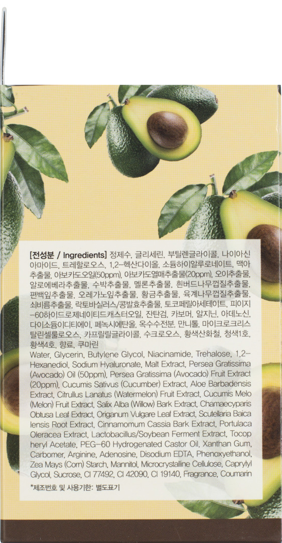 Water, Glycerin, Butylene Glycol, Niacinamide, Trehalose, 1,2-Hexanediol, Sodium Hyaluronate, Malt Extract, Persea Gratissima (Avocado) Oil(50ppm), Persea Gratissima (Avocado) Fruit Extract(20ppm), Cucumis Sativus (Cucumber) Extract, Aloe Barbadensis Extract, Citrullus Lanatus (Watermelon) Fruit Extract, Cucumis Melo (Melon) Fruit Extract, Salix Alba (Willow) Bark Extract, Chamaecyparis Obtusa Leaf Extract, Origanum Vulgare Leaf Extract, Scutellaria Baicalensis Root Extract, Cinnamomum Cassia Bark Extract, Portulaca Oleracea Extract, Lactobacillus/Soybean Ferment Extract, Tocopheryl Acetate, PEG-60 Hydrogenated Castor Oil, Xanthan Gum, Carbomer, Arginine, Adenosine, Disodium EDTA, Phenoxyethanol, Zea Mays (Corn) Starch, Mannitol, Microcrystalline Cellulose, Caprylyl Glycol, Sucrose, CI 77492, CI 42090, CI 19140, Fragrance, Coumarin.