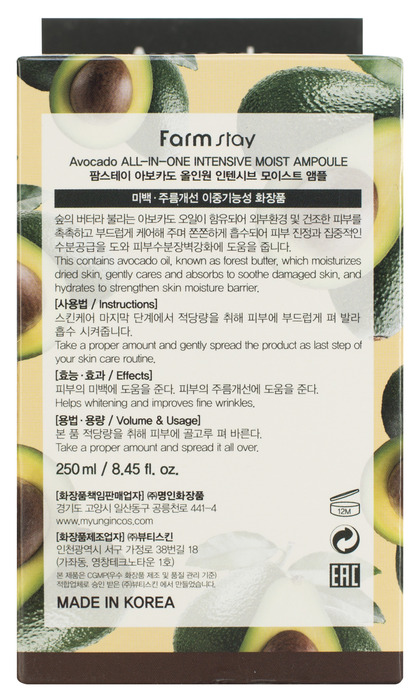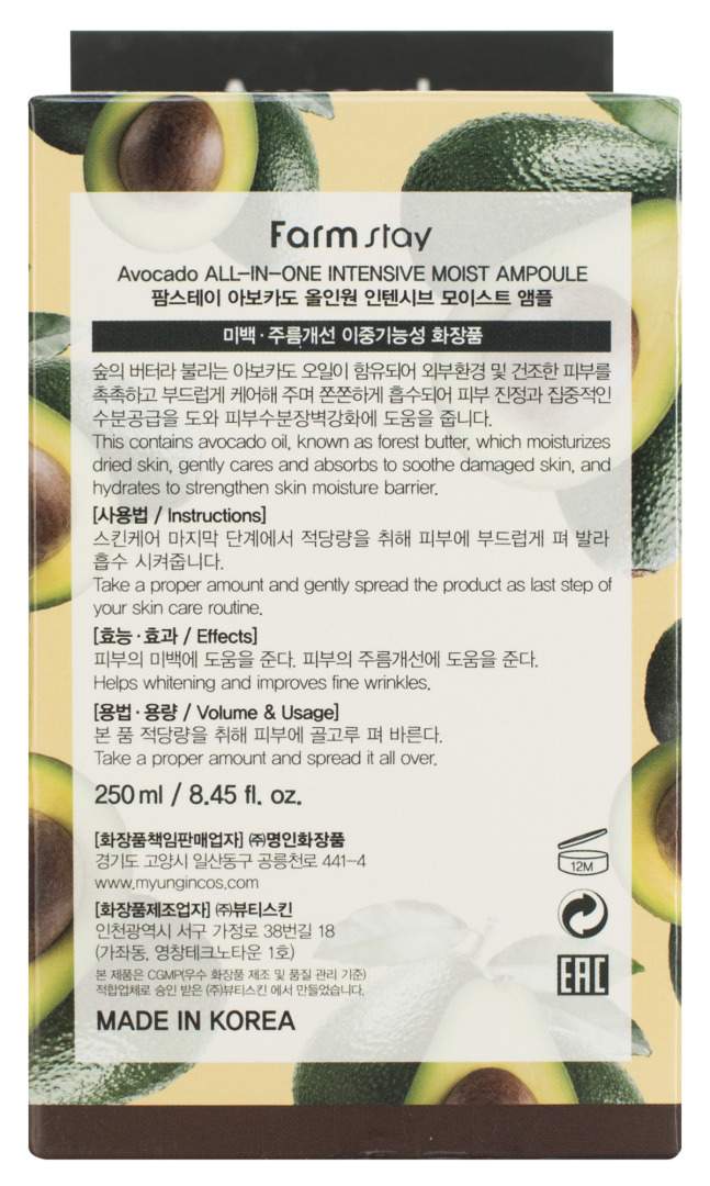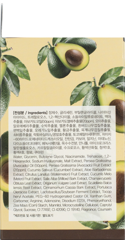 Изготовитель: MYUNGIN COSMETICS CO. LTD., 441-4, Gongneungcheon-ro, Ilsandong-gu, Goyang-si, Gyeonggi-do, РЕСП. КОРЕЯ. Сыворотка с авокадо для увлажнения лица и тела. Сыворотка насыщает ценными жирными кислотами и витаминами, смягчает даже сухую и огрубевшую кожу. Регулирует гидролипидный баланс, успокаивает раздражения и шелушения, придает гладкость и бархатистость. Универсальная сыворотка успокаивает и смягчает кожу, ускоряет регенерацию, улучшает эластичность и придает тонус. Способ применения: Сыворотка с маслом авокадо наносится на очищенную и тонизированную кожу легкими массажными движениями.