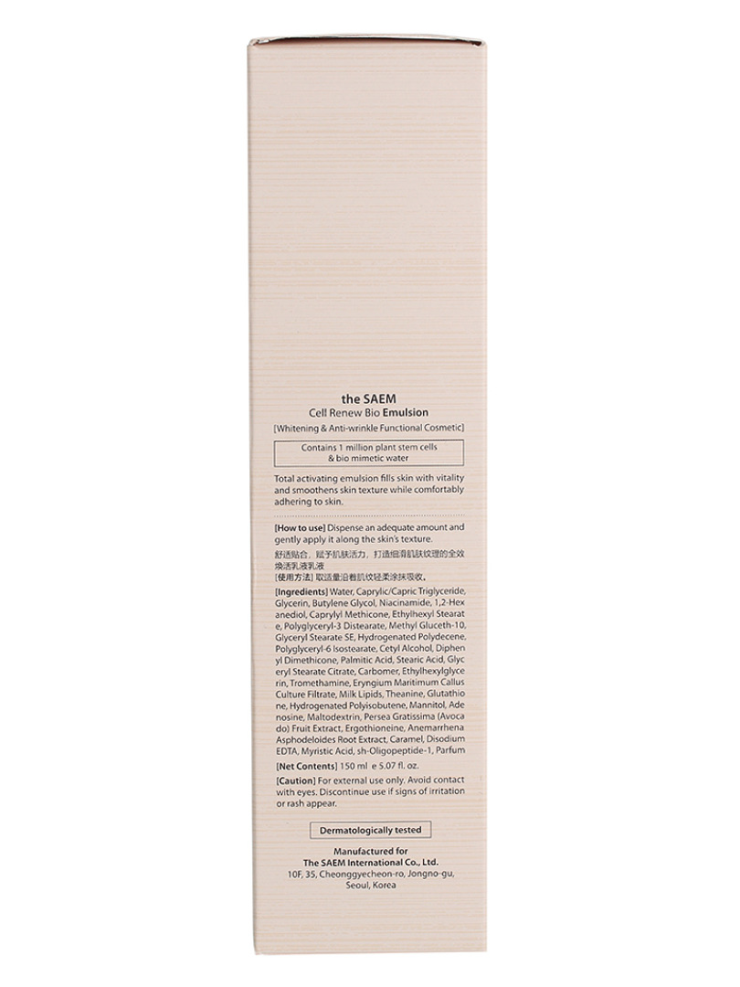 Изг-ль: «THE SAEM INTERNATIONAL CO.LTD. », КОРЕЯ, РЕСПУБЛИКА, 10F, 35, Cheonggyecheon-ro, Jongno-gu, Seoul. Высокоэффективная биоэмульсия со стволовыми клетками. Линия, в разработке которой использованы новейшие технологии, оказывает мощный омолаживающий эффект, Инновационный ингредиент Voluform наполняет кожу естественным объемом и препятствует ее провисанию. Применение: 1. Нанесите небольшое количество эмульсии на кожу мягкими похлопывающими движениями. 2. Оставьте до полного впитывания. Для лучшего эффекта применять после тоника аналогичной линии.