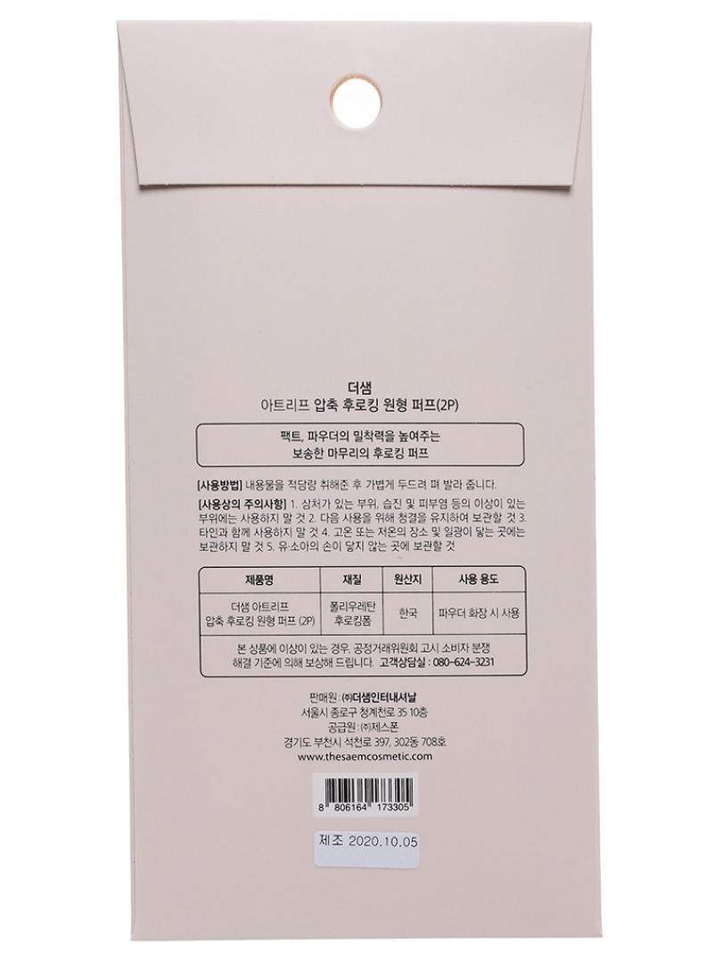 Изготовитель: THE SAEM INTERNATIONAL CO.LTD., КОРЕЯ, РЕСПУБЛИКА, 10F, 35, Cheonggyecheon-ro, Jongno-gu, Seoul. Мягкий пуф круглой формы Art'Lif Round Puff [2P], которым очень удобно наносить компактную или рассыпчатую пудру, создавать идеально гладкое и ровное финальное покрытие, без растягивания кожи, забивания пор тональными средствами.