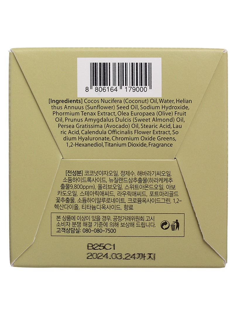 Cocos Nucifera (Coconut) Oil, Water, Helianthus Annuus (Sunflower) Seed Oil, Sodium Hydroxide, Olea Europaea (Olive) Fruit Oil, Fragrance, Prunus Amygdalus Dulcis (Sweet Almond) Oil, Persea Gratissima (Avocado) Oil, Stearic Acid, Lauric Acid, Chromium Oxide Greens, 1,2-Hexanediol, Titanium Dioxide, Calendula Officinalis Flower Extract, Phormium Tenax Extract, Sodium Hyaluronate