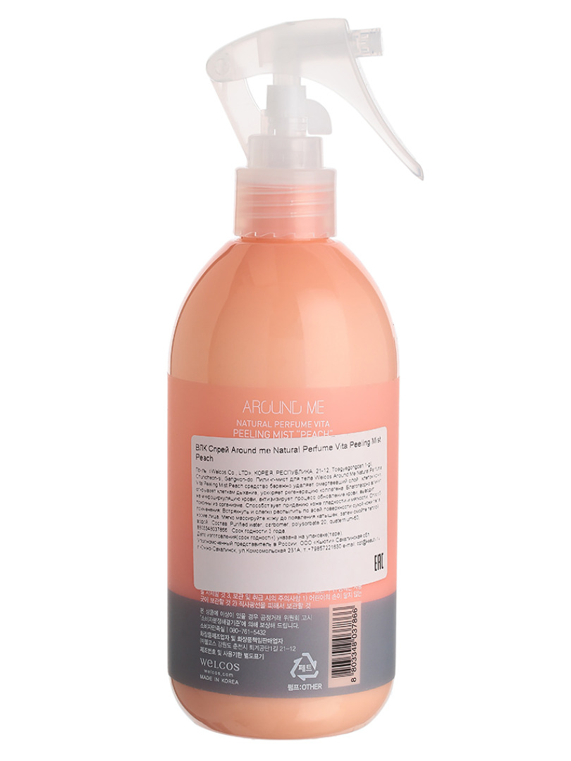 Изготовитель: «Welcos Co., LTD », КОРЕЯ, РЕСПУБЛИКА, 21-12, Toegyegongdan 1-gil, Chuncheon-si, Gangwon-do. Мист для тела Welcos Around Me Natural Perfume Vita Peeling Mist Peach средство бережно удаляет омертвевший слой клеток кожи, открывает клеткам дыхание, ускоряет регенерацию коллагена. Благотворно влияет на микроциркуляцию крови, активизирует процесс обновление крови, выводит токсины из организма. Способствует приданию коже гладкости и мягкости. Способ применения: Встряхнуть и слегка распылить по всей поверхности сухой кожи тела, кроме лица. Мягко массируйте кожу до появления катышек, затем смойте теплой водой.