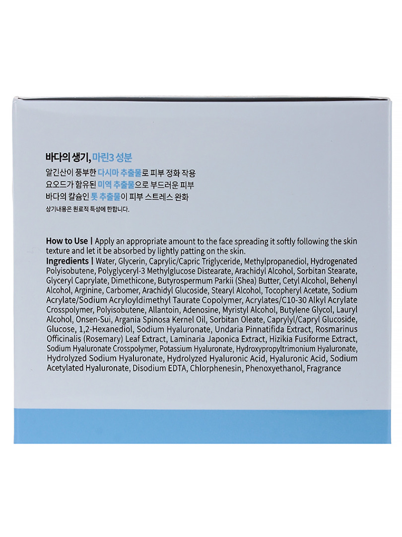 Water, Glycerin, Caprylic/Capric Triglyceride, Methylpropanediol, Hydrogenated Polyisobutene, Polyglyceryl-3 Methylglucose Distearate, Arachidyl Alcohol, Sorbitan Stearate, Glyceryl Caprylate, Dimethicone, Butyrospermum Parkii (Shea) Butter, Cetyl Alcohol, Behenyl Alcohol, Arginine, Carbomer, Arachidyl Glucoside, Stearyl Alcohol, Tocopheryl Acetate, Sodium Acrylate/Sodium Acryloyldimethyl Taurate Copolymer, Acrylates/C10-30 Alkyl Acrylate Crosspolymer, Polyisobutene, Allantoin, Adenosine, Myristyl Alcohol, Butylene Glycol, Lauryl Alcohol, Onsen-Sui, Argania Spinosa Kernel Oil, Sorbitan Oleate, Caprylyl/Capryl Glucoside, Glucose, 1,2-Hexanediol, Sodium Hyaluronate, Undaria Pinnatifida Extract, Rosmarinus Officinalis (Rosemary) Leaf Extract, Laminaria Japonica Extract, Hizikia Fusiforme Extract, Sodium Hyaluronate Crosspolymer, Potassium Hyaluronate, Hydroxypropyltrimonium Hyaluronate, Hydrolyzed Sodium Hyaluronate, Hydrolyzed Hyaluronic Acid, Hyaluronic Acid, Sodium Acetylated Hyaluronate, Disodium EDTA, Chlorphenesin, Phenoxyethanol, Fragrance