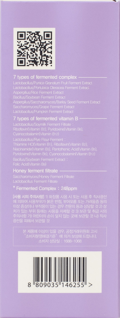 Water, Glycerin, Butylene Glycol, Niacinamide, Acrylates/C10-30 Alkyl Acrylate Crosspolymer, Arginine, Saccharomyces/Honey Ferment Filtrate, Lactobacillus Ferment Filtrate, Lactobacillus/Punica Granatum Fruit Ferment Extract, Lactobacillus/Portulaca Oleracea Ferment Extract, Aspergillus/Rice Ferment Extract, Aspergillus/Saccharomyces/Barley Seed Ferment Extract, Saccharomyces/Grape Ferment Extract, Lactobacillus/Pumpkin Ferment Extract, Lactobacillus/Soymilk Ferment Filtrate, Lactobacillus/Rye Flour Ferment, Bacillus/Soybean Ferment Extract, Propanediol, Thiamine HCl, Riboflavin, Pantothenic Acid, Pyridoxine, Folic Acid, Cyanocobalamin, Bifida Ferment Filtrate, Lactobacillus Ferment, Lactobacillus Ferment Lysate, 1,2-Hexanediol, PEG-60 Hydrogenated Castor Oil, Glyceryl Polyacrylate, Hydroxyacetophenone, Pentylene Glycol, Caprylyl Glycol, Allantoin, Adenosine, Disodium EDTA, Fragrance.