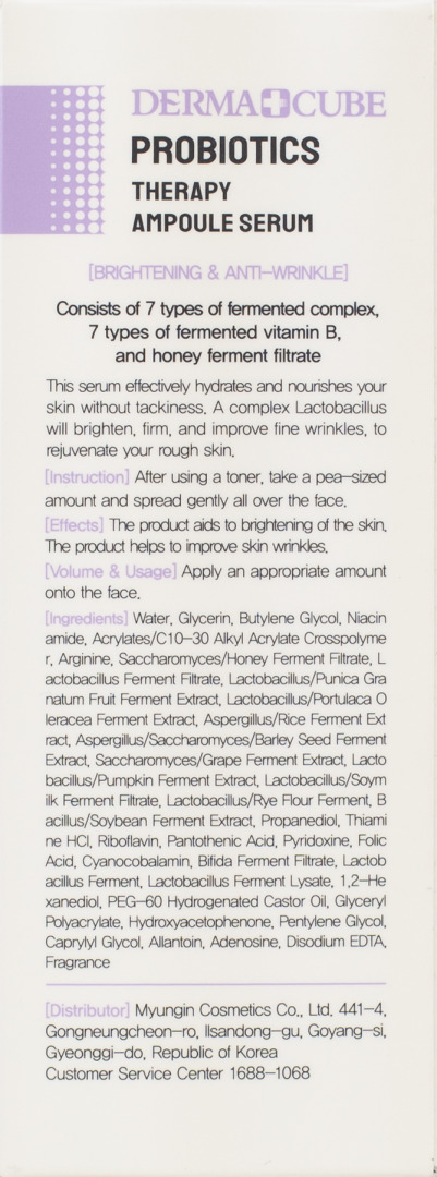 Изготовитель: MYUNGIN COSMETICS CO. LTD., 441-4, Gongneungcheon-ro, Ilsandong-gu, Goyang-si, Gyeonggi-do, РЕСП. КОРЕЯ. Ампульная сыворотка с комплексом пробиотиков подходит для любого типа кожи, особенно рекомендуется для ухода за чувствительной, склонной к обезвоживанию, покраснениям и воспалениям. Сыворотка при нанесении мгновенно дарит ощущение комфорта, эффективно увлажняет и питает кожу, успокаивает, позволяет снять покраснения, избавиться от раздражений и сухости, помогает укрепить иммунитет кожи и восстановить её защитный барьер. Комплекс пробиотиков нормализует состояние микробиома кожи, подавляя жизнедеятельность болезнетворных микроорганизмов, тем самым снижают риск возникновения кожных заболеваний и появление различных высыпаний. Пробиотики создают дополнительный барьер, предотвращающий воздействие агрессивных факторов внешней среды, поддержают естественный иммунитет кожи, замедляют ее старение.Способ применения: Нанести на предварительно очищенную и тонизированную кожу лица.