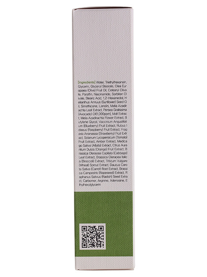 Water, Triethylhexanoin, Glycerin, Glyceryl Stearate, Olea Europaea (Olive) Fruit Oil, Cetearyl Olivate, Paraffin, Niacinamide, Sorbitan Olivate, Stearic Acid, 1,2-Hexanediol, Helianthus Annuus (Sunflower) Seed Oil, Simethicone, Lanolin, Melia Azadirachta Leaf Extract, Persea Gratissima (Avocado) Oil(1,000ppm), Malt Extract, Melia Azadirachta Flower Extract, Butylene Glycol, Vaccinium Angustifolium (Blueberry) Fruit Extract, Rubus Idaeus (Raspberry) Fruit Extract, Fragaria Ananassa (Strawberry) Fruit Extract, Solanum Lycopersicum (Tomato) Fruit Extract, Amber Extract, Medicago Sativa (Alfalfa) Extract, Citrus Aurantium Dulcis (Orange) Fruit Extract, Brassica Oleracea Capitata (Cabbage) Leaf Extract, Brassica Oleracea Italica (Broccoli) Extract, Triticum Vulgare (Wheat) Sprout Extract, Daucus Carota Sativa (Carrot) Root Extract, Brassica Campestris (Rapeseed) Extract, Raphanus Sativus (Radish) Seed Extract, Carbomer, Arginine, Adenosine, Ethylhexylglycerin.