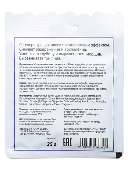 Изготовитель: AROMATICA CO., Республика Корея, 62, Dosan-daero 1-gil, Gangnam-gu, Seoul. Альгинатная маска с муцином улитки стимулирует жизненные силы и регенерирует поврежденные участки кожи, разглаживает мелкие морщинки, снимает раздражение и покраснение. Уменьшает глубину и выраженность мимических морщин, разглаживает рельеф кожи. Применение: Положить порошок и воду в миску в пропорции 1:1, быстро перемешать до однородной массы при помощи шпателя. Нанесите маску слоем 3-5 мм на очищенную кожу лица на 20-25 минут до застывания. Удалить её одним пластом, от подбородка ко лбу. За 2-3 минуты до наложения маски рекомендуется наносить сыворотки, кремы или гели.