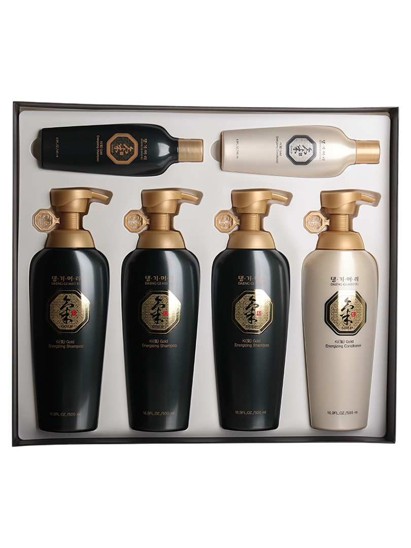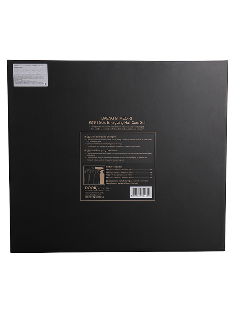 Изготовитель: DOORI COSMETICS Co., LTD., КОРЕЯ, РЕСПУБЛИКА, 588, Dabok-ro, Chubu-myeon, Geumsan-gun, Chungcheongnam-do. В состав набора входят: 1. Шампунь против ломкости волос Daeng Gi Meo Ri Ki Gold Energizing Shampoo бережно очищает и укрепляет волосы. Усиливает кровообращение и стимулирует рост волос, предотвращает появление перхоти. Устраняет сухость, делает волосы упругими и эластичными, возвращает естественный блеск. Обладает освежающим и охлаждающим действием.