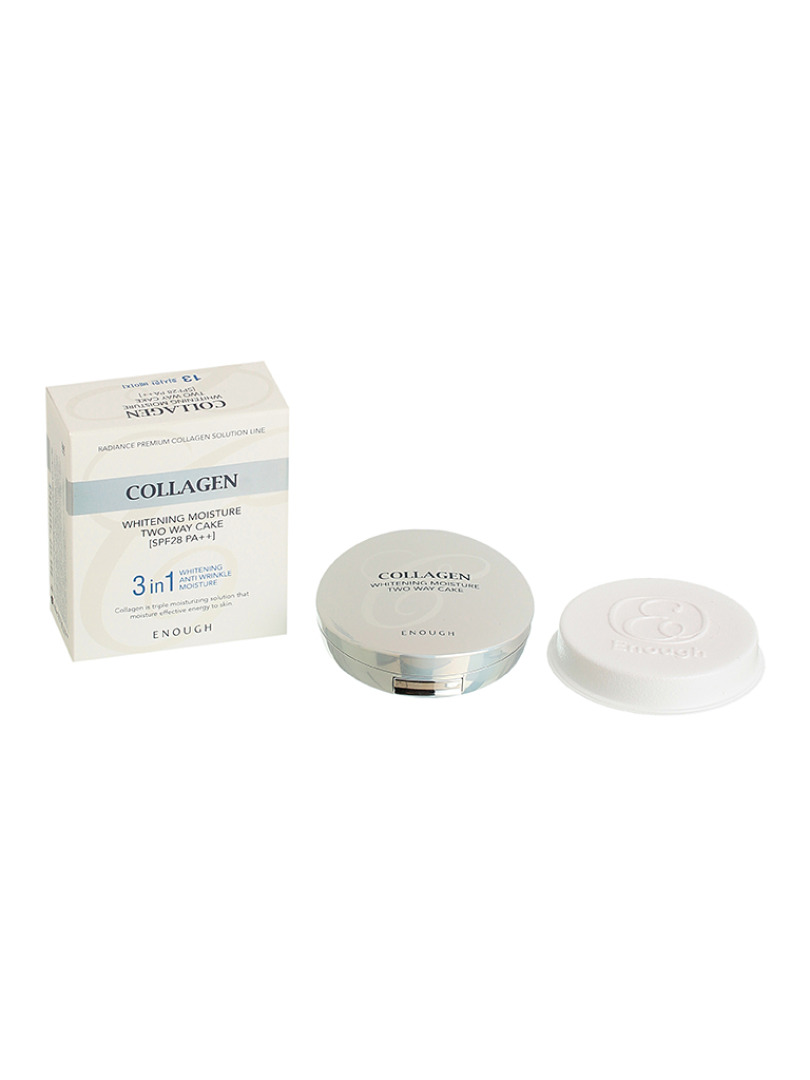 Изготовитель: Enough Co.Ltd., КОРЕЯ, РЕСПУБЛИКА, 6, Dangsan-ro 135beon-gil, Gunpo-si, Gyeonggi-do. Осветляющая пудра со сменным блоком Enough Collagen Whitening Moisture Two Way Cake SPF30 PA+++ улучшает цвет лица, увлажняет и дарит коже лёгкое сияние. Средство делает кожу мягкой и шелковистой, регулирует выработку кожного сала и устраняет жирный блеск, прекрасно справляется с покраснениями, неровным тоном кожи и мягко осветляет. Лёгкая пудра прекрасно фиксирует макияж, не утяжеляя его, а также защищает от негативного воздействия ультрафиолета. Способ применения: Используйте как завершающий этап макияжа или точечно для маскировки несовершенств. Нанесите пудру с помощью спонжа, который идет в комплекте.