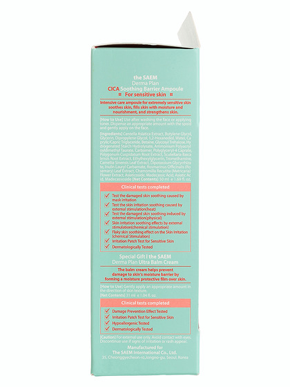 Изготовитель: THE SAEM INTERNATIONAL CO.LTD., КОРЕЯ, РЕСПУБЛИКА, 10F, 35, Cheonggyecheon-ro, Jongno-gu, Seoul. Сыворотка интенсивного ухода для чувствительной кожи, которая успокаивает раздражение кожи, наполняет влагой и питательными веществами, а также ухаживает за ослабленной кожей. И крем-бальзам, который придает ощущение увлажнения сухой коже и помогает защитить от повреждения водного барьера кожи. Способ применения: Нанесите средства после очищения кожи. Объем: 50мл+31мл