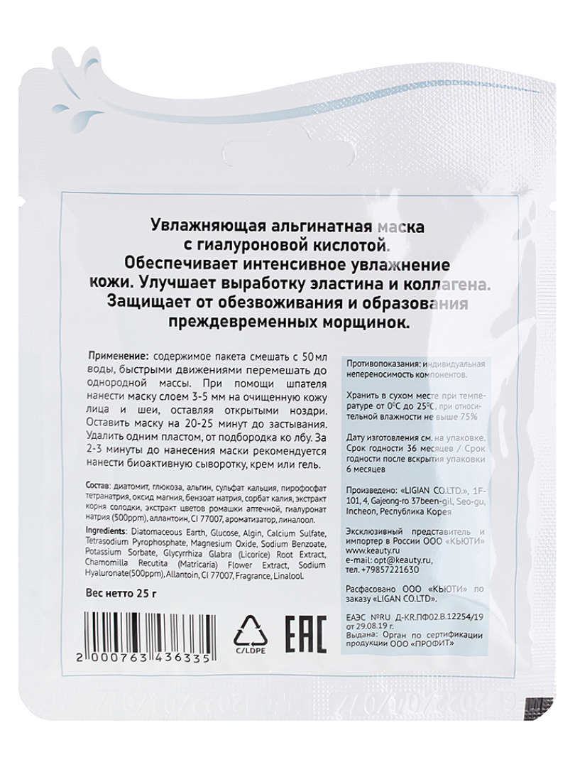 Изготовитель: LIGIAN Co.Ltd., КОРЕЯ, РЕСПУБЛИКА, 1F-101, 4, Gajeong-ro 37beon-gil, Seo-gu, Incheon. Альгинатная маска с гиалуроновой кислотой решает многочисленные проблемы кожи. Помогает сделать ее ухоженной, обновленной, здоровой, гладкой и сияющей. Гиалурон является природным мощным увлажнителем. Создает на поверхности эпителия незаметную пленку, которая препятствует испарению влаги и активно впитывает её из воздуха. Положить порошок мерной чашкой и воду (или активатор) в миску (100 мл порошка 80 мл воды), перемешайте до однородной массы при помощи шпателя, нанесите маску слоем 3-5 мм на очищенную кожу лица на 20-25 минут до застывания. Удалить её одним пластом, от подбородка ко лбу.