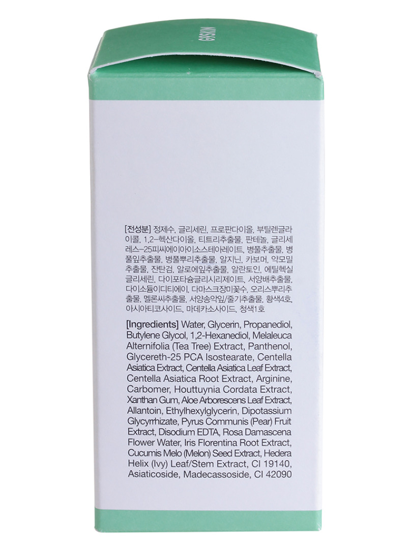 Water, Glycerin, Propanediol, Butylene Glycol, 1,2-Hexanediol, Water, Butylene Glycol, Houttuynia Cordata Extract, Melaleuca Alternifolia (Tea Tree) Extract, Glycerin, 1,2-Hexanediol, Butylene Glycol, Centella Asiatica Root Extract, Centella Asiatica Extract, Centella Asiatica Leaf Extract, Glycerin, 1,2-Hexanediol, Madecassoside, Asiaticoside, Panthenol, Glycereth-25 PCA Isostearate, Carbomer, Arginine, Aloe Arborescens Leaf Extract, Butylene Glycol, Xanthan Gum, Pyrus Communis (Pear) Fruit Extract, Rosa Damascena Flower Water, Iris Florentina Root Extract, Cucumis Melo (Melon) Seed Extract, Hedera Helix (Ivy) Leaf/Stem Extract, Allantoin, Ethylhexylglycerin, Dipotassium Glycyrrhizate, Disodium EDTA, CI 19140, CI 42090