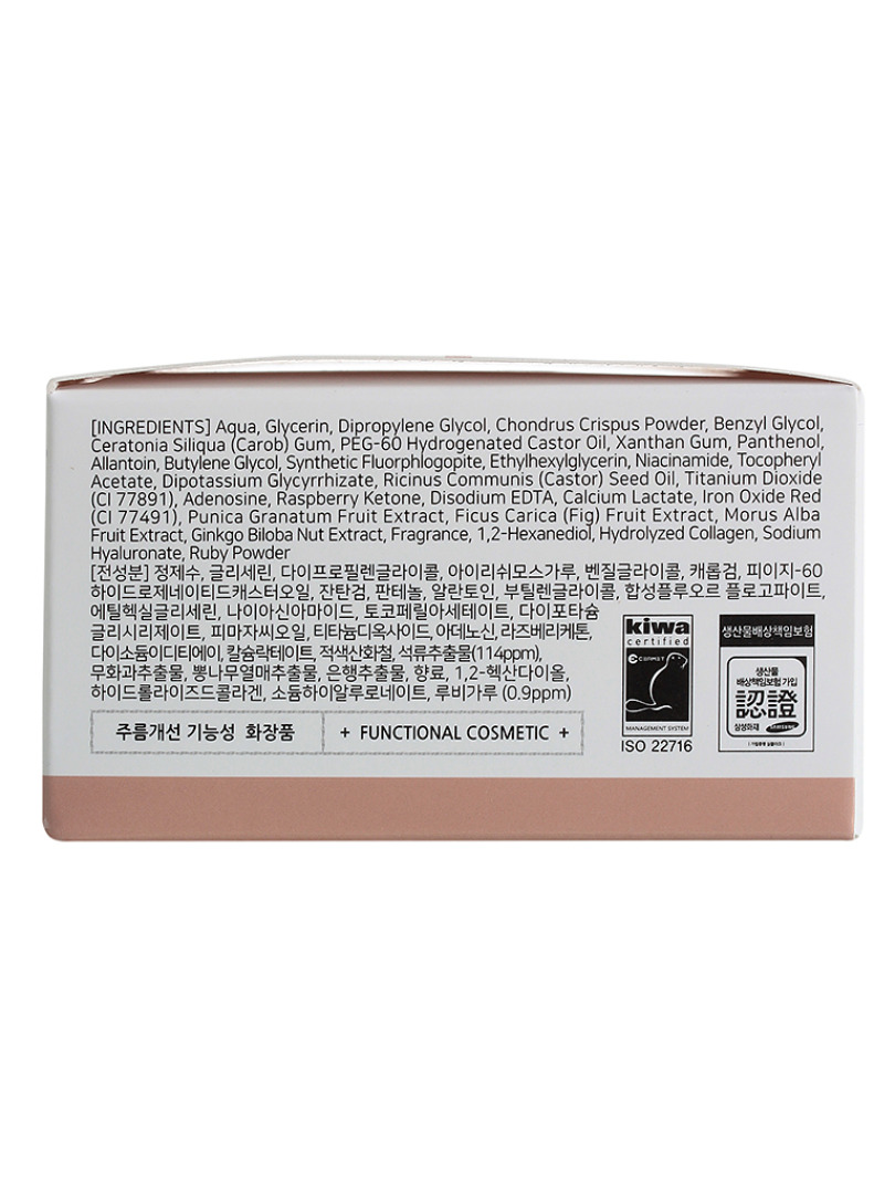 Aqua, Glycerin, Dipropylene Glycol, Chondrus Crispus Powder, Benzyl Glycol, Ceratonia Siliqua (Carob) Gum, PEG-60 Hydrogenated Castor Oil, Xanthan Gum, Panthenol, Allantoin, Butylene Glycol, Synthetic Fluorphlogopite, Ethylhexylglycerin, Niacinamide, Tocopheryl Acetate, Dipotassium Glycyrrhizate, Ricinus Communis (Castor) Seed Oil, Titanium Dioxide, Adenosine, Raspberry Ketone, Disodium EDTA, Calcium Lactate, Iron Oxide Red(CI 77491), Punica Granatum Fruit Extract, Ficus Carica (Fig) Fruit Extract, Morus Alba Fruit Extract, Ginkgo Biloba Nut Extract, Fragrance, 1,2-Hexanediol, Hydrolyzed Collagen, Sodium Hyaluronate, Ruby Powder