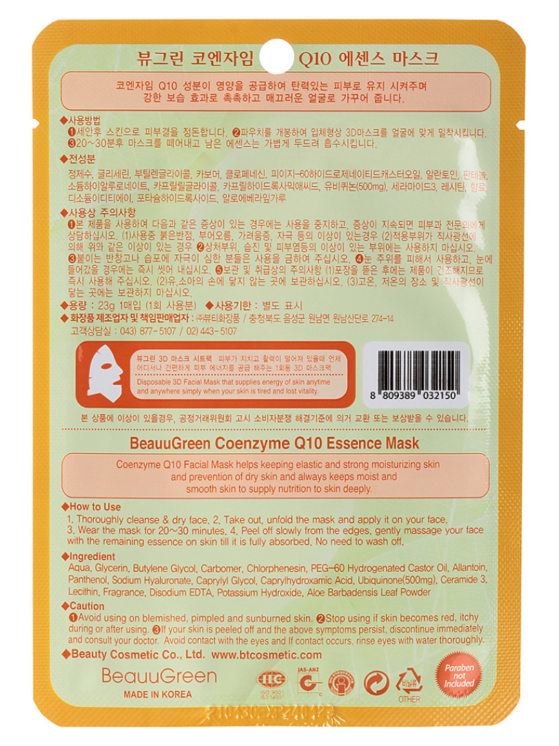 БГР Маска на тканевой основе BeauuGreen Coenzyme Q10 3D Essence Mask