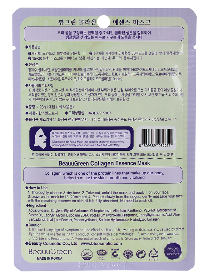 БГР Маска на тканевой основе BeauuGreen Collagen 3D Essence Mask