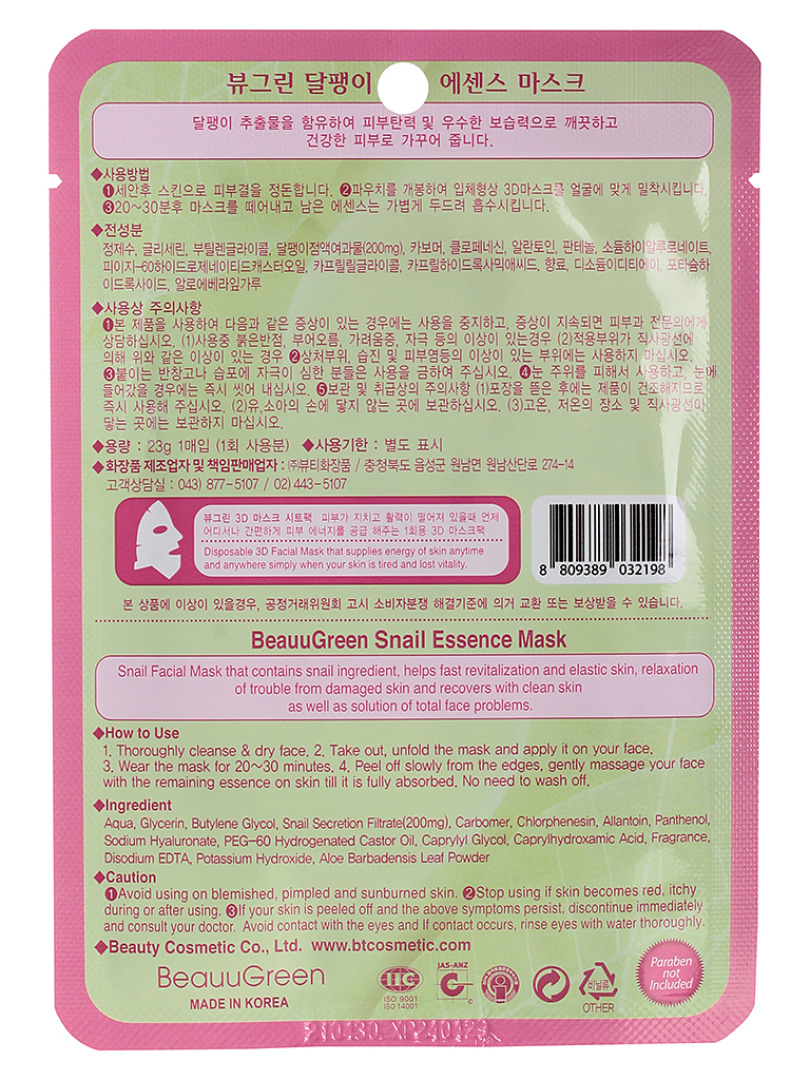 Изготовитель: Beauty Cosmetic Co.,Ltd., КОРЕЯ, РЕСПУБЛИКА, 274-14, Wonnamsandan-ro,Wonnam-myeon, Eumseong-gun, Chungcheongbuk-do. Увлажняющая маска с экстрактом секрета улитки улучшает клеточную регенерацию и разглаживает морщины. Тканевая 3D маска для лица с фильтратом слизи улитки подтягивает и эффективно омолаживает кожу, обладает увлажняющими питательными свойствами, устраняет зуд и шелушение, замедляет процессы старения и увядания, снимает воспаления и выравнивает тон. Способ применения: маску извлечь из упаковки, наложить на очищенное лицо, снять через 20-30 мин. и помассировать лицо, чтобы дать впитаться остаткам средства.