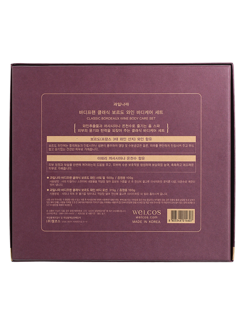 Изг-ль: «Welcos Co., LTD », КОРЕЯ, РЕСПУБЛИКА, 21-12, Toegyegongdan 1-gil, Chuncheon-si, Gangwon-do. Наслаждайтесь домашним спа с винным экстрактом и водой из горячего источника. Классический набор для ухода за телом, чтобы кожа оставалась сияющей и упругой. Применение: Гель для душа: нанесите необходимое количество на губку для душа. Помассируйте все тело. Смойте теплой водой. Лосьон для тела: массирующими движениями равномерно нанесите на все тело.
