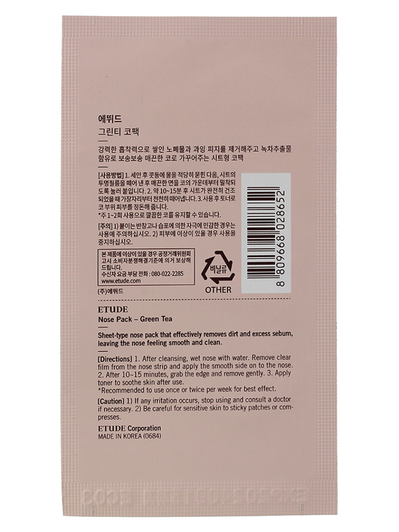 Изготовитель: "Etude Corporation", КОРЕЯ, РЕСПУБЛИКА, 100, Hangang-daero, Yongsan-gu, Seoul. Очищающие полоски с экстрактом зеленого чая для носа. Через поры наша кожа получает необходимый ей кислород, а также выводит пот и лишнее сало. Если своевременно не удалять продукты жизнедеятельности, поры забиваются, при этом кожное сало окисляется и становится темным – это и есть "черные точки". Избавиться от них можно во время салонной процедуры или, сэкономив время и финансы, в домашних условиях. Полоски для носа – великолепный способ эффективной борьбы с "черными точками", они помогут просто и быстро очистить забитые излишками кожного жира, отмершими клетками и пылью поры.