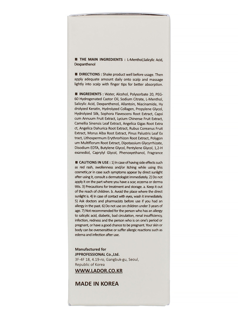 Purified water, Ethanol, Tocopherol, Green tea Extract, Butylene glycol, Ginseng Extract, Cnidium Rhizome Extract, Aloe vera gel, Clycyrrhiza Extract, Calamus Root Extract, Grape Extract, Hinokitiol, Nicotinamide, polyoxyethylene Hydrogenated Caster Oil, peppermint oil.
