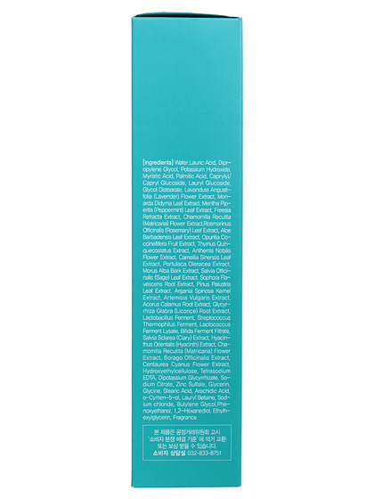 Water, Lauric Acid, Dipropylene Glycol, Potassium Hydroxide, Myristic Acid, Palmitic Acid, Caprylyl/Capryl Glucoside, Lauryl Glucoside, Glycol Distearate, Lavandula Angustifolia (Lavender) Flower Extract, Monarda Didyma Leaf Extract, Mentha Piperita (Peppermint) Leaf Extract, Freesia Refracta Extract, Chamomilla Recutita (Matricaria) Flower Extract, Rosmarinus Officinalis (Rosemary) Leaf Extract, Aloe Barbadensis Leaf Extract, Opuntia Coccinellifera Fruit Extract, Thymus Quinquecostatus Extract, Anthemis Nobilis Flower Extract, Camellia Sinensis Leaf Extract, Portulaca Oleracea Extract, Morus Alba Bark Extract, Salvia Officinalis (Sage) Leaf Extract, Sophora Flavescens Root Extract, Pinus Palustris Leaf Extract, Argania Spinosa Kernel Extract, Artemisia Vulgaris Extract, Acorus Calamus Root Extract, Glycyrrhiza Glabra (Licorice) Root Extract, Lactobacillus Ferment, Streptococcus Thermophilus Ferment, Lactococcus Ferment Lysate, Bifida Ferment Filtrate, Salvia Sclarea (Clary) Extract, Hyacinthus Orientalis (Hyacinth) Extract, Chamomilla Recutita (Matricaria) Flower Extract, Borago Officinalis Extract, Centaurea Cyanus Flower Extract, Hydroxyethylcellulose, Tetrasodium EDTA, Dipotassium Glycyrrhizate, Sodium Citrate, Zinc Sulfate, Glycerin, Glycine, Stearic Acid, Arachidic Acid, o-Cymen-5-ol, Lauryl Betaine, Sodium chloride, Butylene Glycol, Phenoxyethanol, 1,2-Hexanediol, Ethylhexylglycerin, Fragrance