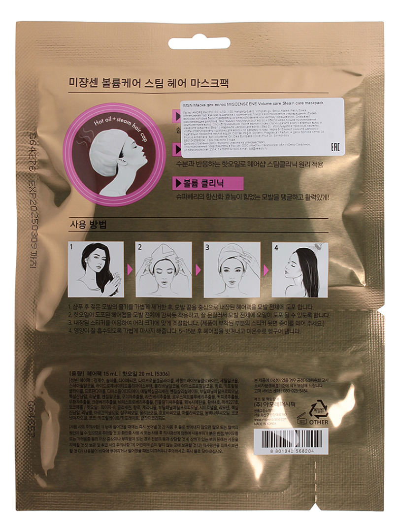 Изготовитель: AMORE PACIFIC CO.,LTD., 100, Hangang-daero, Yongsan-gu, Seoul, Корея, Республика. Интенсивная паровая маска-шапочка с горячим маслом для восстановления и возвращения объема волосам, которые были подвержены химической завивке или частому окрашиванию. Оказывает разогревающее действие, тем самым стимулируя рост волос и обеспечивая лучшее проникновение компонентов в волос. Способ применения: После мытья головы слегка удалите влагу с влажных волос и нанесите средство (Step 1). Наденьте шапочку для волос (Step 2). Используйте встроенную наклейку, чтобы отрегулировать «шапочку для волос » по размеру головы. Через 5-15 минут снимите шапочку и тщательно промойте теплой водой.