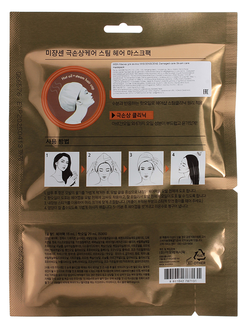 Изготовитель: AMORE PACIFIC CO.,LTD., 100, Hangang-daero, Yongsan-gu, Seoul, Корея, Республика. Интенсивная паровая маска-шапочка с горячим маслом для поврежденных и сухих волос. Оказывает разогревающее действие, тем самым стимулируя рост волос и обеспечивая лучшее проникновение компонентов в волос. После использования волосы становятся мягкими и блестящими. Способ применения: После мытья головы слегка удалите влагу с влажных волос и нанесите средство (Step 1). Наденьте шапочку для волос (Step 2). Используйте встроенную наклейку, чтобы отрегулировать «шапочку для волос » по размеру головы. Через 5-15 минут снимите шапочку и тщательно промойте теплой водой.