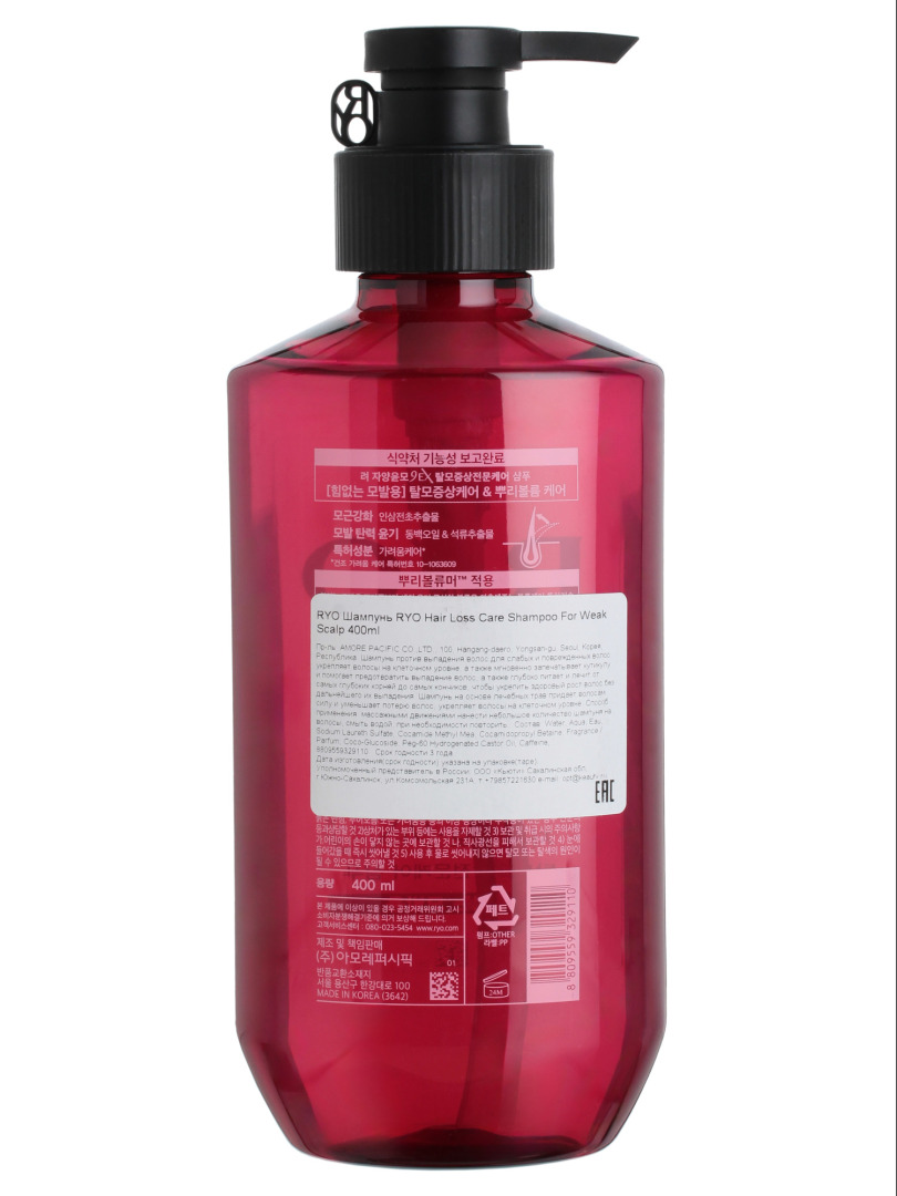 Изготовитель: AMORE PACIFIC CO.,LTD., 100, Hangang-daero, Yongsan-gu, Seoul, Корея, Республика. Шампунь против выпадения волос для слабых и поврежденных волос укрепляет волосы на клеточном уровне, а также мгновенно запечатывает кутикулу и помогает предотвратить выпадение волос, а также глубоко питает и лечит от самых глубоких корней до самых кончиков, чтобы укрепить здоровый рост волос без дальнейшего их выпадения. Шампунь на основе лечебных трав придает волосам силу и уменьшает потерю волос, укрепляет волосы на клеточном уровне. Способ применения: массажными движениями нанести небольшое количество шампуня на волосы, смыть водой, при необходимости повторить.
