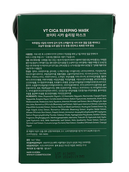 Изготовитель: VT COSMETIC CO., LTD., Республика Корея, 23, Samseong-ro 76-gil, Gangnam-gu, Seoul. Ночная маска, которая обладает легкой быстровпитывающейся текстурой, успокоит чувствительную и раздраженную кожу, уменьшит воспалительные элементы, покраснения и восстановит поврежденную кожу, повышает кожный иммунитет, борется с высыпаниями, интенсивно увлажняет обезвоженную кожу, восстанавливает водный баланс, и удерживает влагу как внутри так и на поверхности кожи, препятствуя потере влаги. Применение: Нанесите маску на кожу лица после использования тонера. Используйте маску за 1-1.5 часа до сна. Рекомендуется использовать ночную маску 1-2 раза в неделю.