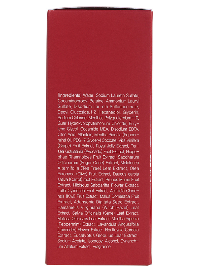 Water, Ammonium lauryl sulfate, Sodium benzoate, Phenoxyethanol, Cocamidopropyl betaine, Sodium chloride, Peg-8, Disodium laurenth sulfosuccinate, Glycerin, Urea, Cocamide MEA, Propylene glycol, Fragrance, Betaine, Guar hydroxypropyltrimonium chloride, Menthol, Salicylic acid, Panthenol, Hydrogenated lecithin, Grape seed oil, Ceramide 1, Ceramide 2, Ceramide 3, Ceramide 4, Ceramide 6II, 1,2-Hexanediol, Cirtic acid, Butylene glycol, Glycine, Serine, Glutamic acid, Aspartic acid, Leucine, Alanine, Lysine, Arginine, Tyrosine, Hydrolyzed collagen, Hydrolyzed keratin, Gelatin, Oat kernel extract, Hydrolyzed corn protein, Hydrolyzed wheat protein, Hydrolyzed soy protein, Allantoin, Sodium chloride, Macadamia ternifolia seed oil