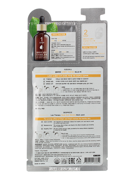 Изготовитель:GREENCOS Co.Ltd., Республика Корея, 64-30, Hagunsandan 1-ro, Yangchon-eup, Gimpo-si, Gyeonggi-do. Маска -сыворотка включает в себя двух фазный уход. Первая фаза -интенсивная сыворотка с глубоко проникающим действием, наносится на очищенную кожу, похлопывающими движениями, до полного впитывания; Вторая фаза- тканевая маска, оказывает питательное, расслабляющее действие, дает коже отдохнуть, кожа приобретает насыщенный и здоровый цвет лица.