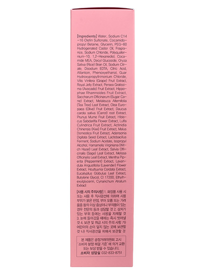 Water, Sodium C14-16 Olefin Sulfonate, Cocamidopropyl Betaine, Glycerin, PEG-60 Hydrogenated Castor Oil, Fragrance (Hexyl Cinnamal, Linalool), Sodium Chloride, Polyquaternium-10, 1,2-Hexanediol, Cocamide MEA, Decyl Glucoside, Oryza Sativa (Rice) Bran Oil, Sodium Citrate, Phenoxyethanol, Disodium EDTA, Citric Acid, Allantoin, Guar Hydroxypropyltrimonium Chloride, Houttuynia Cordata Extract, Sophora Flavescens Root Extract, Scutellaria Baicalensis Root Extract, Polygonum Multiflorum Root Extract, Glycyrrhiza Uralensis (Licorice) Root Extract, Centella Asiatica Extract, Angelica Gigas Root Extract, Swertia Japonica Extract, Portulaca Oleracea Extract