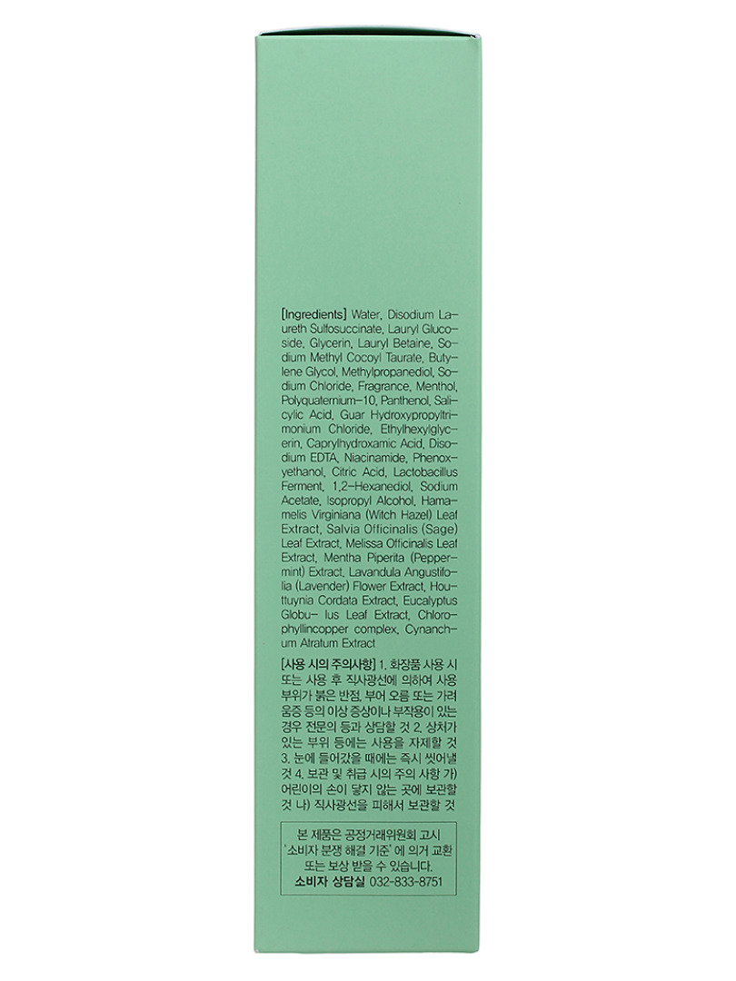 Water, Disodium Laureth Sulfosuccinate, Lauryl Glucoside, Glycerin, Lauryl Betaine, Sodium Methyl Cocoyl Taurate, Butylene Glycol, Methylpropanediol, Sodium Chloride, Fragrance, Menthol, Polyquaternium-10, Panthenol, Salicylic Acid, Guar Hydroxypropyltrimonium Chloride, Caprylhydroxamic Acid, Disodium EDTA, Ethylhexylglycerin, Niacinamide, Phenoxyethanol, Citric Acid, Lactobacillus Ferment, 1,2-Hexanediol, Sodium Acetate, Eucalyptus Globulus Leaf Extract, Hamamelis Virginiana (Witch Hazel) Leaf Extract