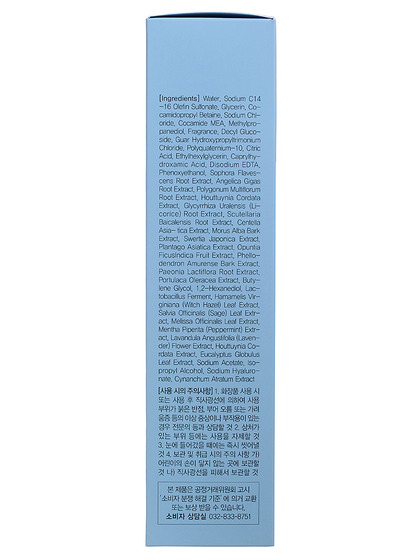 Water, Sodium C14-16 Olefin Sulfonate, Glycerin, Cocamidopropyl Betaine, Sodium Chloride, Cocamide MEA, Methylpropanediol, Fragrance, Decyl Glucoside, Guar Hydroxypropyltrimonium Chloride, Polyquaternium-10, Citric Acid, Ethylhexylglycerin, Phenoxyethanol, Disodium EDTA, Caprylhydroxamic Acid, Sophora Flavescens Root Extract, Scutellaria Baicalensis Root Extract, Polygonum Multiflorum Root Extract, Houttuynia Cordata Extract, Glycyrrhiza Uralensis (Licorice) Root Extract, Centella Asiatica Extract, Angelica Gigas Root Extract, Swertia Japonica Extract, Portulaca Oleracea Extract, Plantago Asiatica Extract