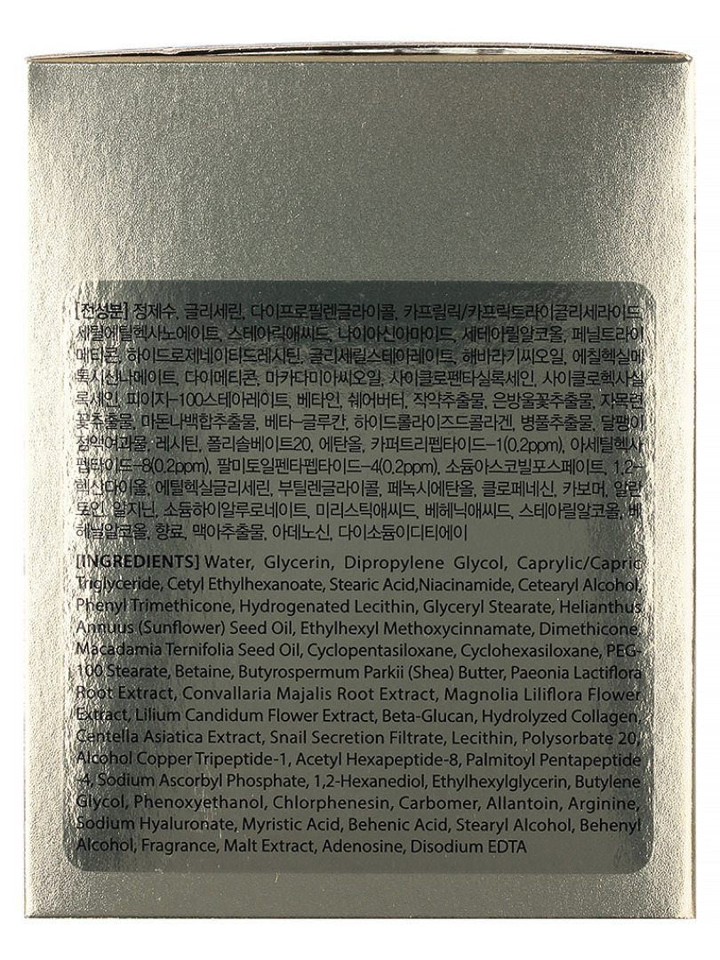 Water, Glycerin, Dipropylene Glycol, Caprylic/Capric Triglyceride, Cetyl Ethylhexanoate, Stearic Acid, Niacinamide, Cetearyl Alcohol, Phenyl Trimethicone, Hydrogenated Lecithin, Glyceryl Stearate, Helianthus Annuus (Sunflower) Seed Oil, Ethylhexyl Methoxycinnamate, Dimethicone, Macadamia Ternifolia Seed Oil, Cyclopentasiloxane, Cyclohexasiloxane, PEG-100 Stearate, Betaine, Butyrospermum Parkii (Shea) Butter, Paeonia Lactiflora Root Extract, Convallaria Majalis Extract, Magnolia Liliflora Flower Extract, Lilium Candidum Flower Extract, Beta-Glucan, Hydrolyzed Collagen, Centella Asiatica Extract, Snail Secretion Filtrate, Lecithin, Polysorbate 20, Alcohol, Copper Tripeptide-1, Acetyl Hexapeptide-8, Palmitoyl Pentapeptide-4, Sodium Ascorbyl Phosphate, 1,2-Hexanediol, Ethylhexylglycerin, Butylene Glycol, Phenoxyethanol, Chlorphenesin, Carbomer, Allantoin, Arginine, Sodium Hyaluronate, Myristic Acid, Behenic Acid, Stearyl Alcohol, Behenyl Alcohol, Fragrance, Malt Extract, Adenosine, Disodium EDTA,