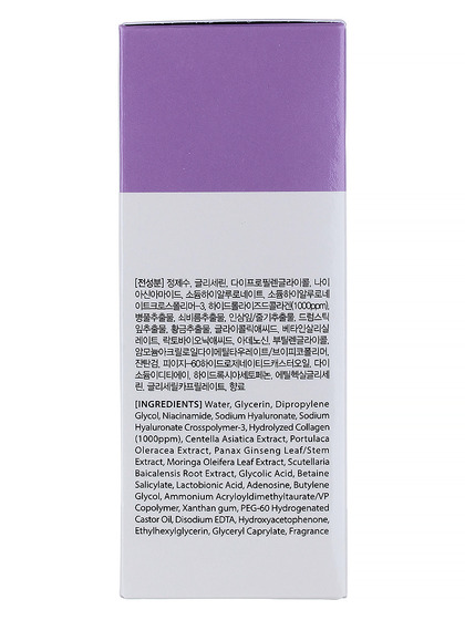 Water, Glycerin, Dipropylene Glycol, Niacinamide, Sodium Hyaluronate, Sodium Hyaluronate Crosspolymer-3, hydrolyzed Collagen(1000ppm), Centella Asiatica Extract, Portulaca Oleracea Extract, Panax Ginseng Leaf/Stem Extract, Moringa Oleifera Leaf Extract, Scutellaria Baicalensis Root Extract, Glycolic Acid, Betaine Salicylate, Lactobionic Acid, Adenosine, Butylene Glycol, Ammonium Acryloyldimethyltaurate/VP Copolymer, Xanthan gum, PEG-60 Hydrogenated Castor Oil, Disodium EDTA, Hydroxyacetophenone, Ethylhexylglycerin, Glyceryl Caprylate, Fragrance