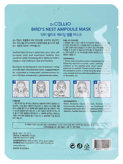 Изготовитель: You&Me Cosmetic, Корея, Республика, 7, Dangjeong-ro, Gunpo-si, Gyeonggi-do. Тканевая маска для лица с экстрактом ласточкиного гнезда Dr.Cellio Bird"s Nest Ampoule Mask. Вытяжка из материала ласточкиных гнезд способствует обновлению кожи, поддерживает её здоровье и повышает увлажненность,способствуя очищению и увлажнению кожи. Маска-салфетка состоит из нетканого полотна, выкроенного по форме лица с прорезями для носа, глаз и губ. Салфетка пропитана специальным составом для интенсивного ухода за кожей. Уникальная формула маски содержит полезные вещества, нежная и мягкая основа свободно ложится на кожу, легко впитывается. Использование: 1. После умывания и использования тонера нанести маску. 2. Оставить на 15-20 минут, затем аккуратно снять маску. 3. Похлопывающими движениями распределить остатки средства, до полного поглощения.