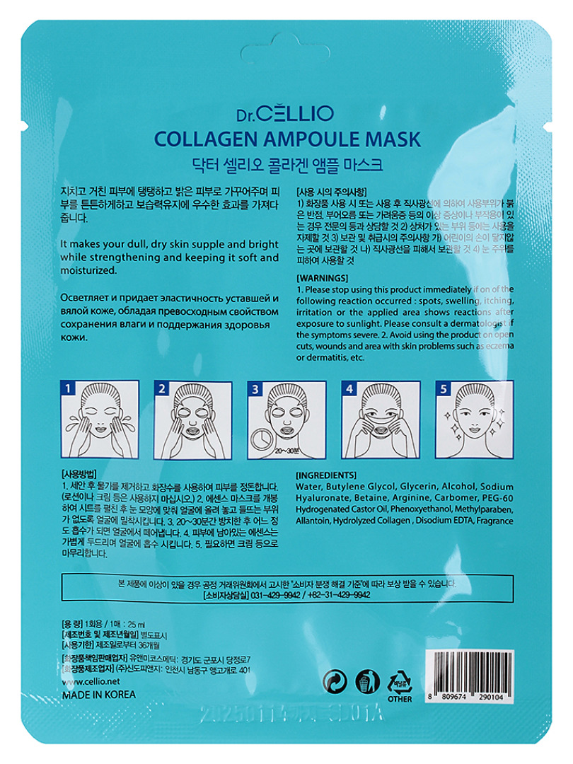 Изготовитель: You&Me Cosmetic, Корея, Республика, 7, Dangjeong-ro, Gunpo-si, Gyeonggi-do. Тканевая маска для лица с коллагеном Dr.Cellio Collagen Ampoule Mask. Осветляет и придаёт эластичность уставшей и вялой коже, обладая превосходным свойством сохранения влаги и поддержания здоровья кожи. Маска-салфетка состоит из нетканого полотна, выкроенного по форме лица с прорезями для носа, глаз и губ. Салфетка пропитана специальным составом для интенсивного ухода за кожей. Уникальная формула маски содержит полезные вещества, нежная и мягкая основа свободно ложится на кожу, легко впитывается. Использование: 1. После умывания и использования тонера нанести маску. 2. Оставить на 15-20 минут, затем аккуратно снять маску. 3. Похлопывающими движениями распределить остатки средства, до полного поглощения.