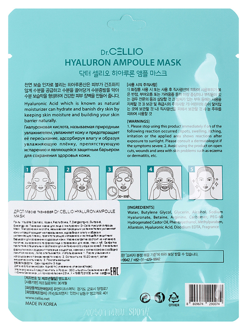 Изготовитель: You&Me Cosmetic, Корея, Республика, 7, Dangjeong-ro, Gunpo-si, Gyeonggi-do. Тканевая маска для лица с гиалуроном Dr.Cellio Hyaluron Ampoule Mask. Гиалуроновая кислота, называемая природным увлажнителем,увлажняет кожу и предотвращает её пересыхание, адсорбируя влагу и образуя увлажняющую плёнку, препятствующую испарению и являющейся защитным барьером для сохранения здоровья кожи. Маска-салфетка состоит из нетканого полотна, выкроенного по форме лица с прорезями для носа, глаз и губ. Салфетка пропитана специальным составом для интенсивного ухода за кожей. Уникальная формула маски содержит полезные вещества, нежная и мягкая основа свободно ложится на кожу, легко впитывается. Использование: 1. После умывания и использования тонера нанести маску. 2. Оставить на 15-20 минут, затем аккуратно снять маску. 3. Похлопывающими движениями распределить остатки средства, до полного поглощения.