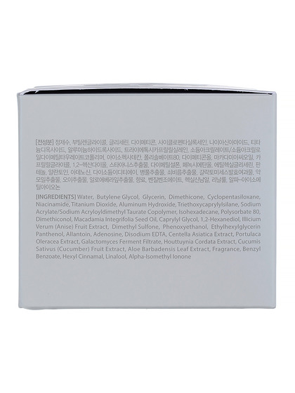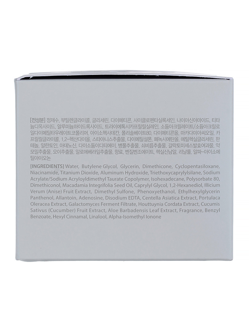 Water, Butylene Glycol, Glycerin, Dimethicone, Cyclopentasiloxane, Niacinamide, Titanium Dioxide, Aluminum Hydroxide, Triethoxycaprylylsilane, Sodium Acrylate/Sodium Acryloyldimethyl Taurate Copolymer, Isohexadecane, Polysorbate 80, Dimethiconol, Macadamia Integrifolia Seed Oil, Caprylyl Glycol, 1,2-Hexanediol, Illicium Verum (Anise) Fruit Extract, Dimethyl Sulfone, Phenoxyethanol, Ethylhexylglycerin, Panthenol, Allantoin, Adenosine, Disodium EDTA, Centella Asiatica Extract, Portulaca Oleracea Extract, Galactomyces Ferment Filtrate, Houttuynia Cordata Extract, Cucumis Sativus (Cucumber) Fruit Extract, Aloe Barbadensis Leaf Extract, Fragrance, Benzyl Benzoate, Hexyl Cinnamal, Linalool, Alpha-Isomethyl Ionone