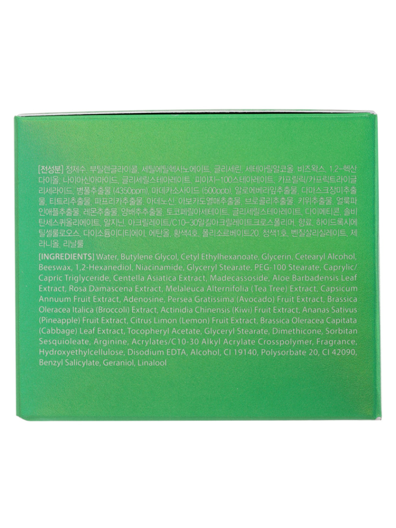 Water, Butylene Glycol, Cetyl Ethylhexanoate, Glycerin, Cetearyl Alcohol, Beeswax , 1,2-Hexanediol, Niacinamide, Glyceryl Stearate, PEG-100 Stearate, Caprylic/Capric Triglyceride, Centella Asiatica Extract, Madecassoside, Aloe Barbadensis Leaf Extract, Rosa Damascena Extract, Melaleuca Alternifolia (Tea Tree) Extract, Capsicum Annuum Fruit Extract, Adenosine, Persea Gratissima (Avocado) Fruit Extract, Brassica Oleracea Italica (Broccoli) Extract, Actinidia Chinensis (Kiwi) Fruit Extract, Ananas Sativus (Pineapple) Fruit Extract, Citrus Limon (Lemon) Fruit Extract, Brassica Oleracea Capitata (Cabbage) Leaf Extract, Tocopheryl Acetate, Glyceryl Stearate, Dimethicone, Sorbitan Sesquioleate, Arginine, Acrylates/C10-30 Alkyl Acrylate Crosspolymer, Fragrance, Hydroxyethylcellulose, Disodium EDTA, Alcohol, CI 19140, Polysorbate 20, CI 42090, Benzyl Salicylate, Geraniol, Linalool