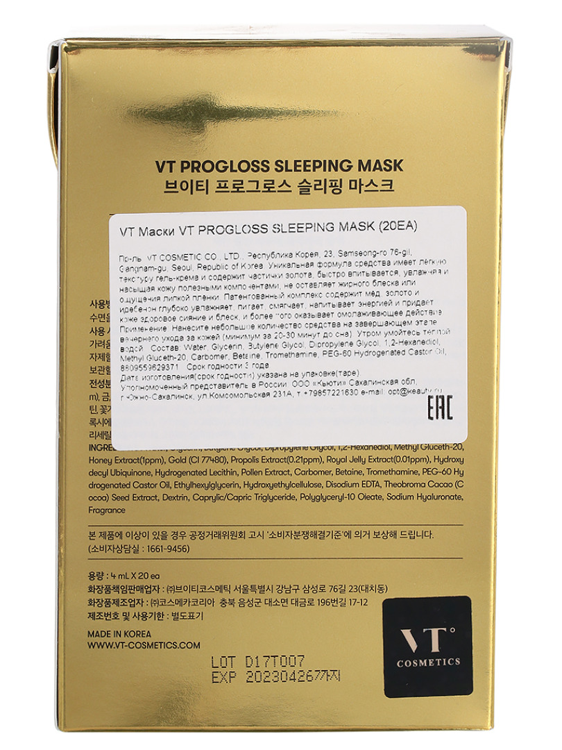 Изготовитель: VT COSMETIC CO., LTD., Республика Корея, 23, Samseong-ro 76-gil, Gangnam-gu, Seoul, Republic of Korea. Уникальная формула средства имеет лёгкую текстуру гель-крема и содержит частички золота, быстро впитывается, увлажняя и насыщая кожу полезными компонентами, не оставляет жирного блеска или ощущения липкой плёнки. Патентованный комплекс содержит мёд, золото и идебенон глубоко увлажняет, питает, смягчает, напитывает энергией и придает коже здоровое сияние и блеск, и более того оказывает омолаживающее действие. Применение: Нанесите небольшое количество средства на завершающем этапе вечернего ухода за кожей (минимум за 20-30 минут до сна). Утром умойтесь тёплой водой.