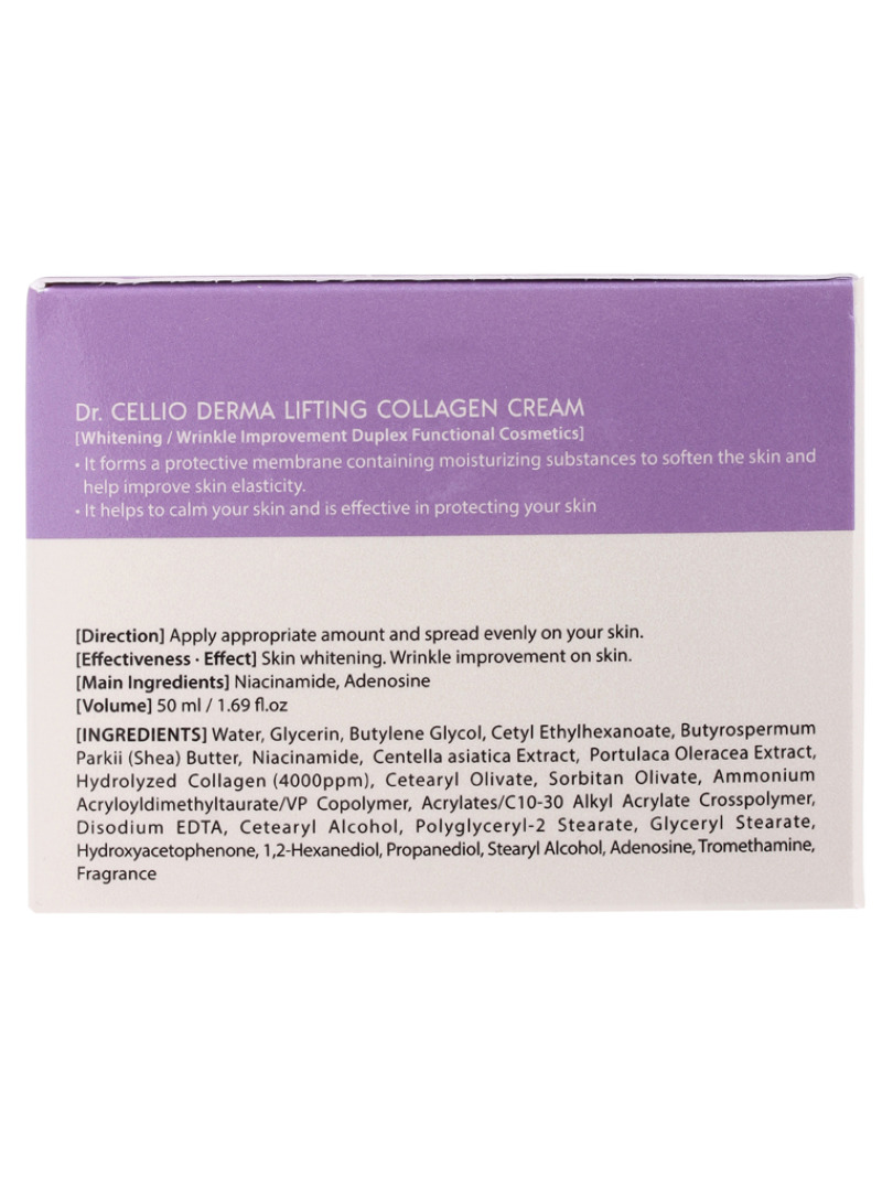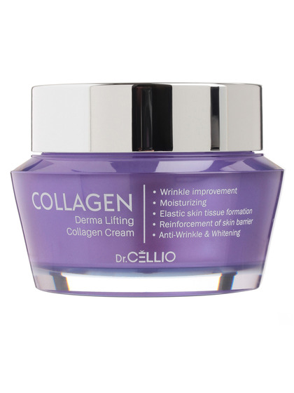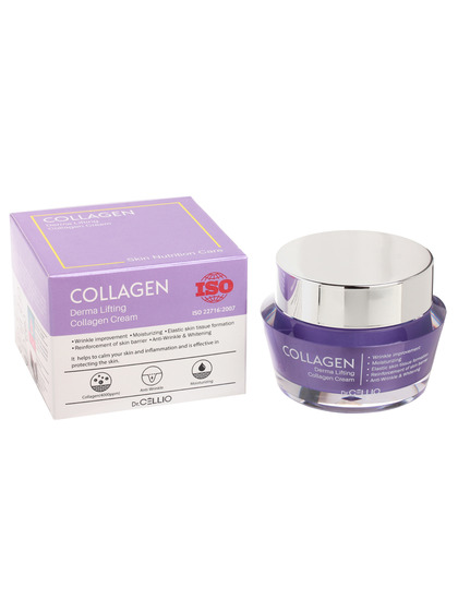 Изготовитель: You&Me Cosmetic, Корея, Республика, 7, Dangjeong-ro, Gunpo-si, Gyeonggi-do. Восстанавливающий крем Dr.Cellio Derma Lifting Collagen Cream интенсивно увлажняет кожу, делая ее подтянутой и упругой. Гидролизированный коллаген лучше всего усваивается организмом. Это один из главных структурных белков кожи, от которого зависит ее эластичность и тургор. Коллаген обеспечивает моментальный подтягивающий эффект, кожа становится гладкой и упругой. Способ применения: Небольшое количество крема нанести на лицо и шею, нежными похлопывающими движениями распределить крем по поверхности кожи.