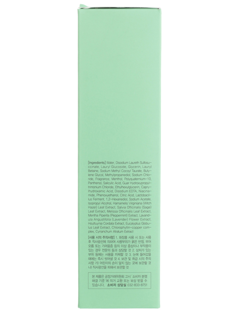 Water, Disodium Laureth Sulfosuccinate, Lauryl Glucoside, Glycerin, Lauryl Betaine, Sodium Methyl Cocoyl Taurate, Butylene Glycol, Methylpropanediol, Sodium Chloride, Fragrance, Menthol, Polyquaternium-10, Panthenol, Salicylic Acid, Guar Hydroxypropyltrimonium Chloride, Caprylhydroxamic Acid, Disodium EDTA, Ethylhexylglycerin, Niacinamide, Phenoxyethanol, Citric Acid, Lactobacillus Ferment, 1,2-Hexanediol, Sodium Acetate, Eucalyptus Globulus Leaf Extract, Hamamelis Virginiana (Witch Hazel) Leaf Extract