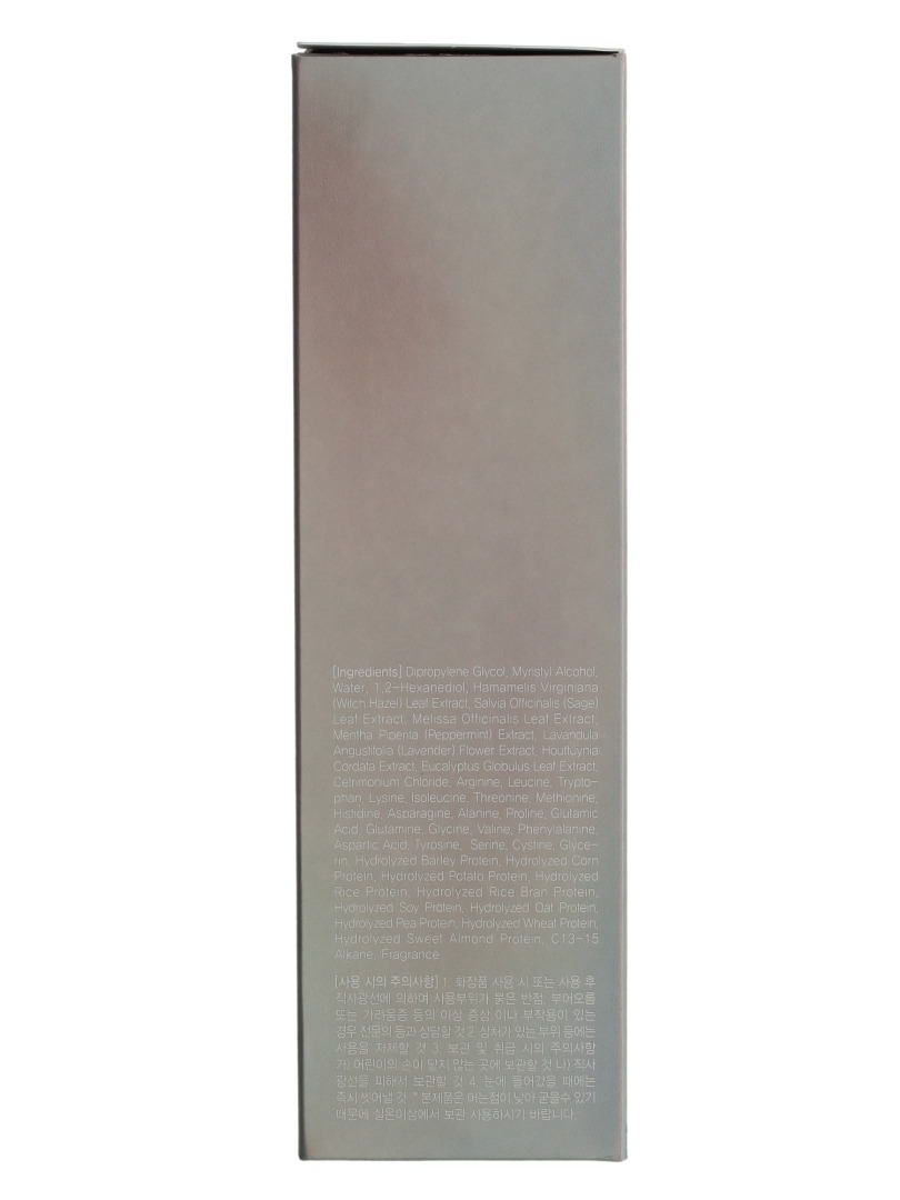 Dipropylene Glycol, Myristyl Alcohol, Water, Fragrance, Cetrimonium Chloride, 1,2-Hexanediol, C13-15 Alkane, Hamamelis Virginiana (Witch Hazel) Leaf Extract, Salvia Officinalis (Sage) Leaf Extract, Melissa Officinalis Leaf Extract, Mentha Piperita (Peppermint) Extract, Lavandula Angustifolia (Lavender) Flower Extract, Houttuynia Cordata Extract, Eucalyptus Globulus Leaf Extract, Glycerin, Hydrolyzed Barley Protein, Hydrolyzed Corn Protein, Hydrolyzed Potato Protein, Hydrolyzed Rice Protein, Hydrolyzed Rice Bran Protein, Hydrolyzed Soy Protein, Hydrolyzed Oat Protein, Hydrolyzed Pea Protein, Hydrolyzed Wheat Protein, Hydrolyzed Sweet Almond Protein, Arginine, Leucine, Tryptophan, Lysine