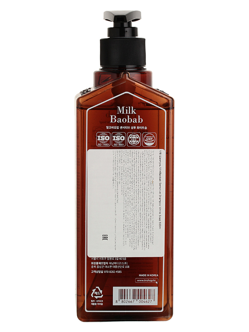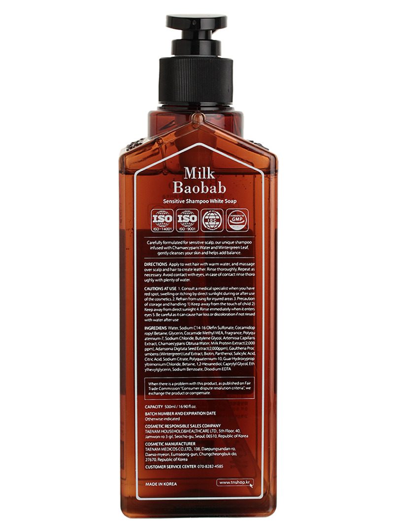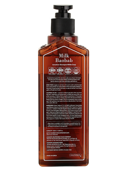MB SWS Шампунь для волос бессульфатный и бессиликоновый с экстрактом белого мыла MilkBaobab Sensitive Shampoo White Soap 500ml