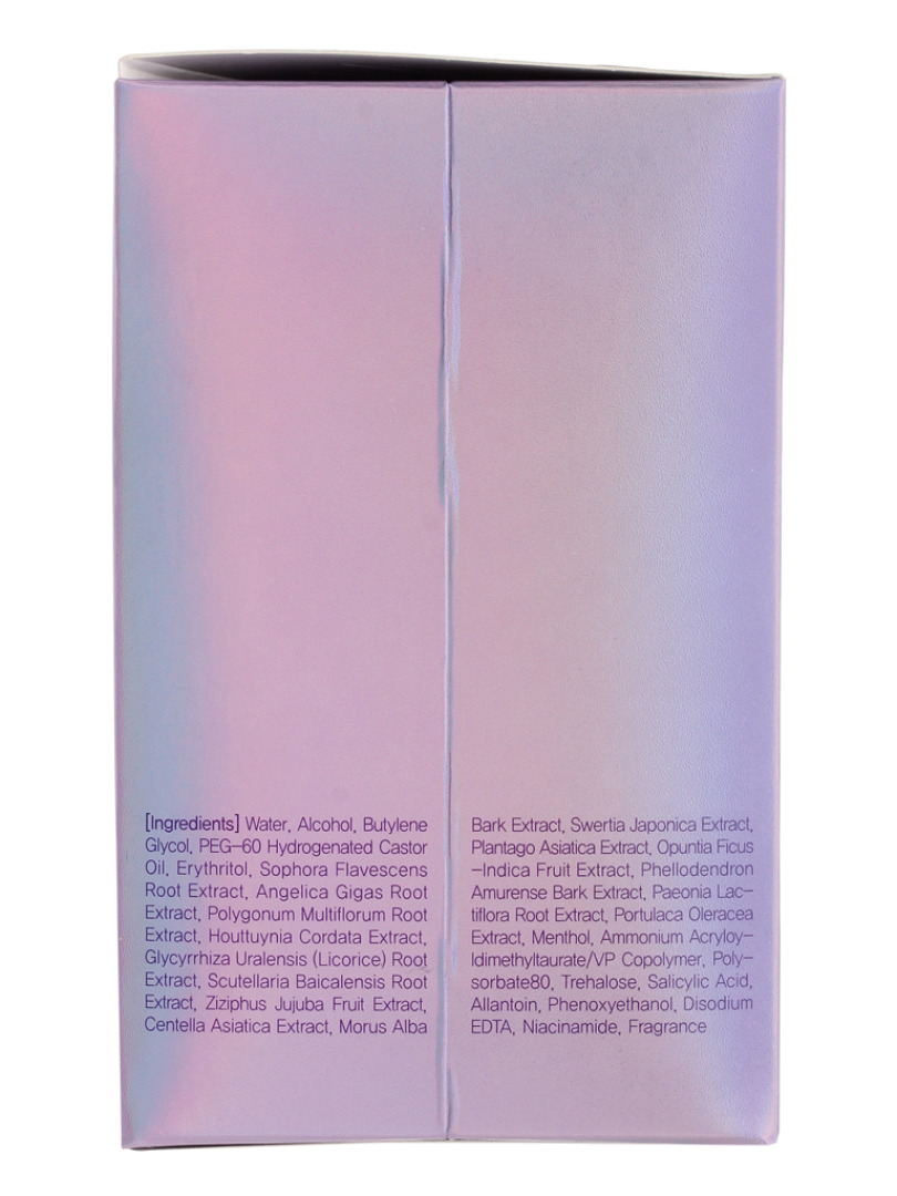 Water, Alcohol, Butylene Glycol, PEG-60 Hydrogenated Castor Oil, Erythritol, Sophora Flavescens Root Extract, Polygonum Multiflorum Root Extract, Houttuynia Cordata Extract, Glycyrrhiza Uralensis (Licorice) Root Extract, Angelica Gigas Root Extract, Ziziphus Jujuba Fruit Extract, Swertia Japonica Extract, Scutellaria Baicalensis Root Extract, Portulaca Oleracea Extract, Plantago Asiatica Extract, Phellodendron Amurense Bark Extract, Paeonia Lactiflora Root Extract, Opuntia Ficus-Indica Fruit Extract, Morus Alba Bark Extract, Centella Asiatica Extract, Menthol, Ammonium Acryloyldimethyltaurate/VP Copolymer, Polysorbate 80, Trehalose, Salicylic Acid, Allantoin, Phenoxyethanol, Disodium EDTA, Niacinamide, Fragrance