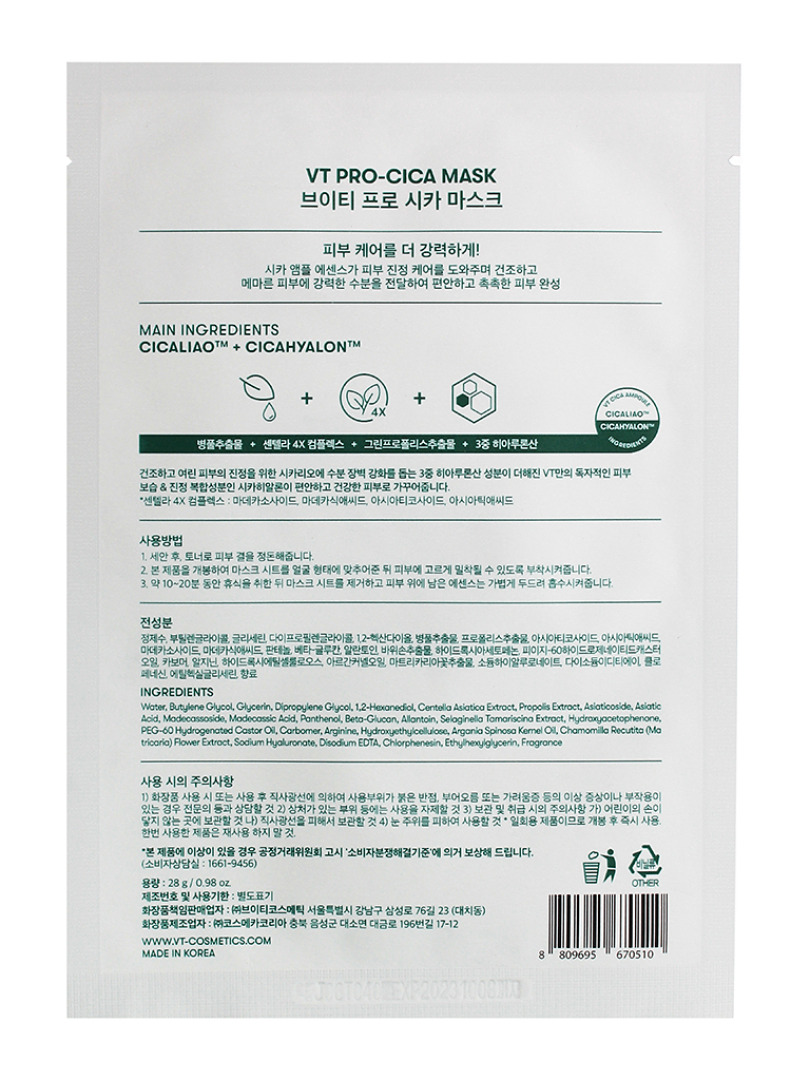 Изготовитель: VT COSMETIC CO., LTD., Республика Корея, 23, Samseong-ro 76-gil, Gangnam-gu, Seoul. Маска оказывает моментальное успокаивающее и тонизирующее действие, интенсивно питает и насыщает кожу живительной влагой, обеспечивая максимально длительное увлажнение на всех её уровнях, придаёт блеск и здоровое сияние. Идеально подходит для сухой, обезвоженной и чувствительной кожи. Способ применения: На предварительно очищенную и тонизированную кожу лица равномерно наложите маску, избегая зоны вокруг глаз и губ. Оставьте на 10-20 мин. Аккуратно снимите маску и нежными движениями вмассируйте остатки эссенции в кожу до полного впитывания.